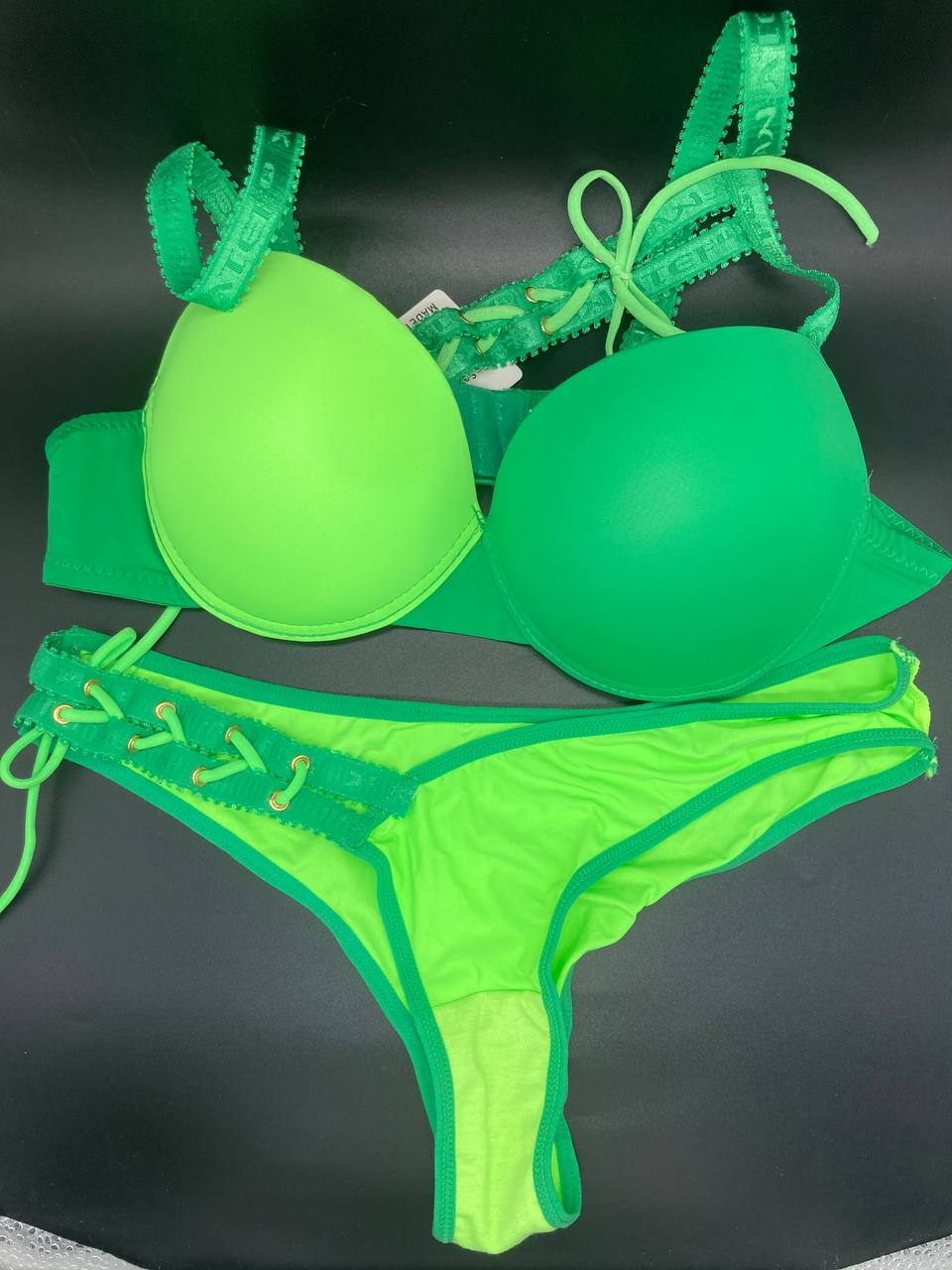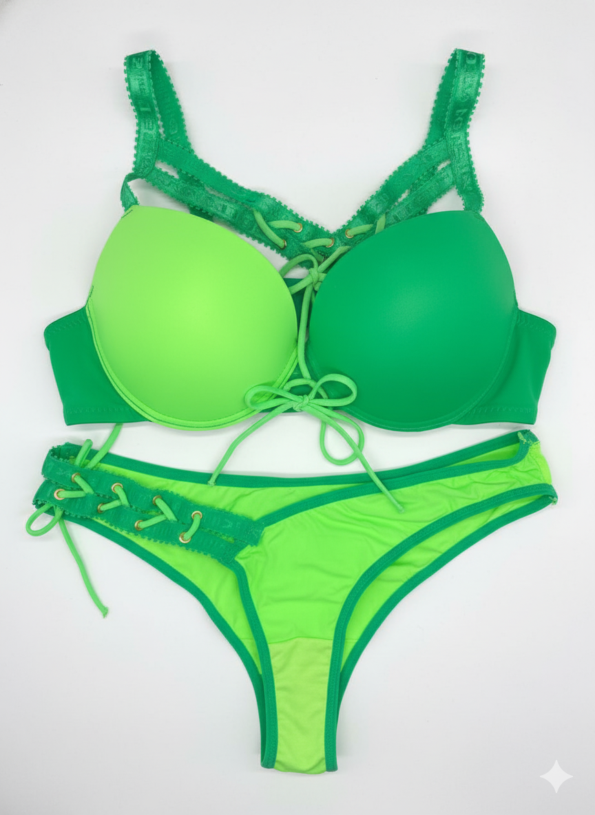 برق و جسارت با ست لباس زیر نئون!اگر از مدلهای تکراری خسته شدهاید و به دنبال ست لباس زیری هستید که واقعاً متفاوت باشد، این مدل برای شما ساخته شده است. طراحی بندینک دار (Lace-Up) و ترکیب دو رنگ سبز زنده، آن را برای شبهای خاص، زیر لباسهای تیره یا به عنوان یک لباس زیر مجلسی تبدیل به یک شاهکار کرده است.ویژگیهامزایا و دلایل خریدترکیب رنگ دوگانه جسورانهرنگ سبز لیمویی نئونی و یشمی؛ فوقالعاده خاص و مدرن، مناسب برای خانمهایی که اعتمادبهنفس بالایی دارند.سوتین Push-Up قوی/متوسطفرمدهی ماکسیمم و لیفت سینه، ایدهآل برای لباسهای یقه باز.بندهای ضربدری (Lace-Up) در جلوجزئیات فانتزی و جذاب که توجه را به ناحیه دکلته جلب میکند.شورت فانتزی بندینکدارجزئیات بندینک در کنارههای شورت، تکمیلکننده ظاهر فریبنده ست.